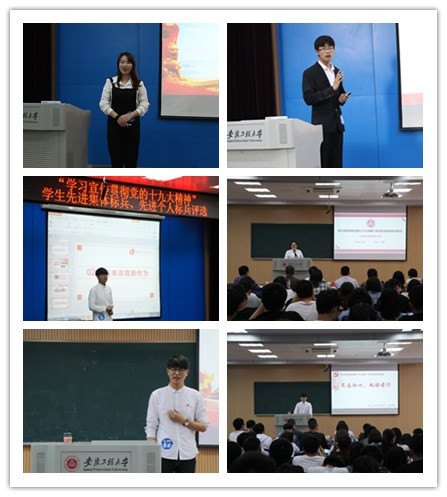 4月前,是学习实施阶段。全体学生积极响应学习宣传贯彻党的十九大精神的号召,广泛利用各种学习平台,如各级各类党的十九大精神学习培训、学习竞赛、学习讨论、学习实践、主题演讲、主题征文等活动,充分发挥个体能动性,将个人自学与团队学习相结合,将线下学习与线上学习相连合,将理论学习与社会实践相融合,将知识学习与理性思考相契合,将假期学习和在校学习相整合,积极开展学习、记录学习、展现学习成效,做到学有所获、学有所思、学有所悟、学有所用,努力在新时代开启人生新征程、续写人生新篇章。4月中旬,各学院根据评选内容要求,结合本院实际,以进一步推动和总结“学习宣传贯彻党的十九大精神”工作为导向,组织开展本学院内先进集体与先进个人的评选,全校总计评选出1000个先进个人和100个先进集体。在此基础上,向学校推荐标兵集体、标兵个人。