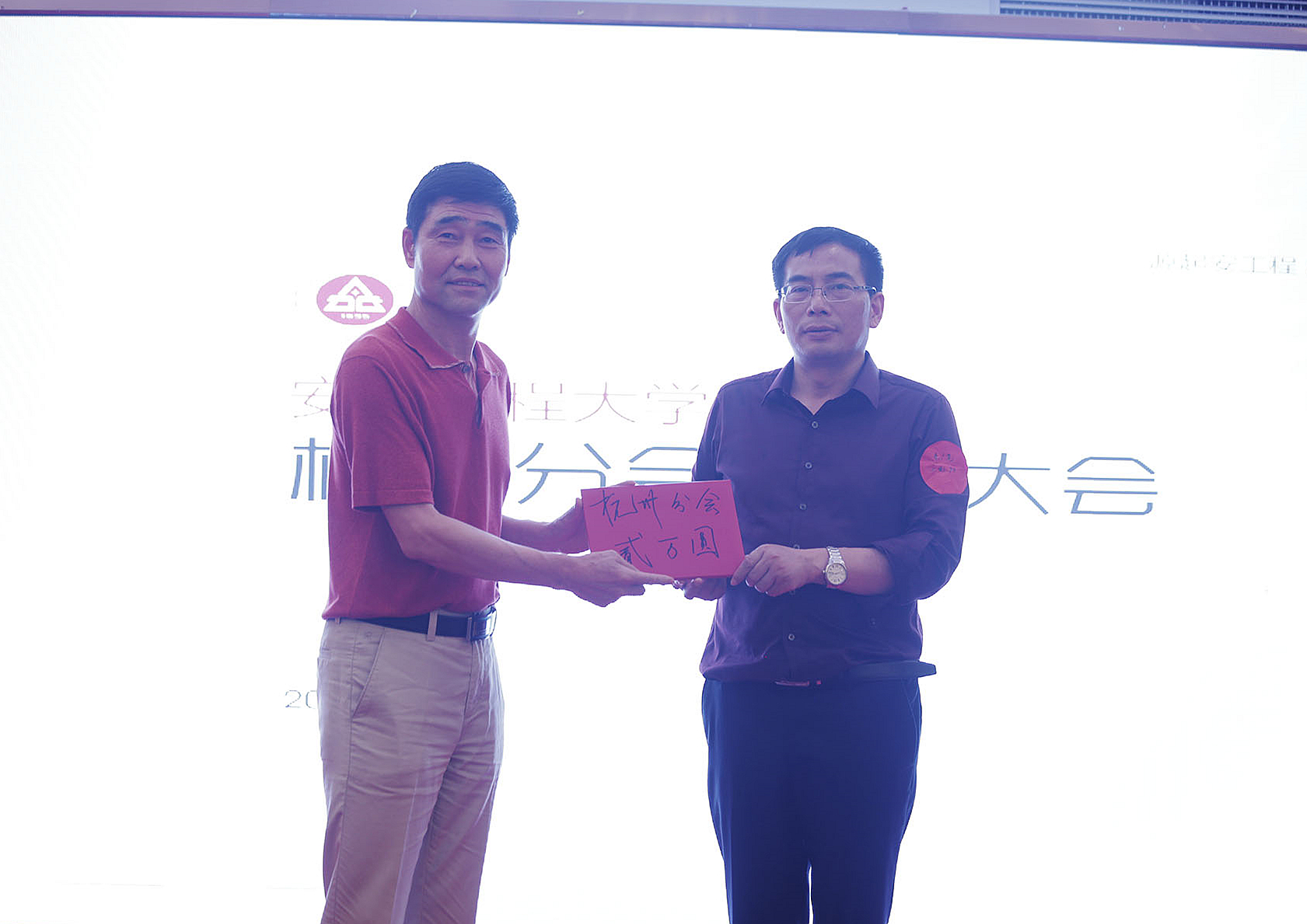 陈其工向朱广尧授予“安徽工程大学校友会杭州分会”牌并与之共同揭牌,校友怀着激动的心情全体起立,会场顿时响起了雷鸣般的掌声。