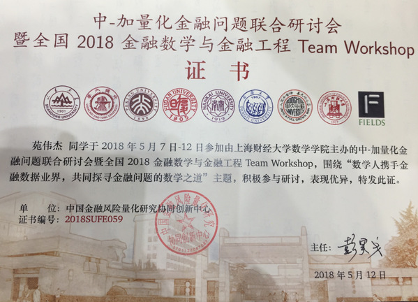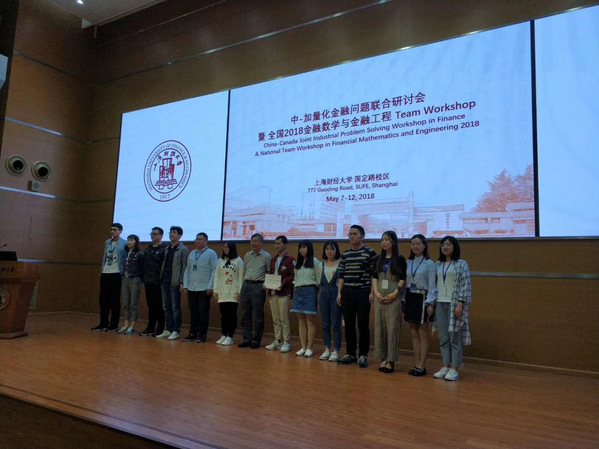 5月7日至12日,为期一周的“中-加量化金融问题联合研讨会暨全国2018金融数学与金融工程Team Workshop”在上海财经大学举办。中国科学院院士、山东大学教授彭实戈,加拿大Fields数学研究所副所长黄华雄,以及来自中国、加拿大、美国、法国等国内外专家学者,HSBC Paris、OANDA、华院数据、MathWorks(中国)、郑州商品交易所、深圳证券交易所等著名金融机构和数据公司的研究人员共120余人参加了此次研讨会。我校6名研究生代表参加了此次会议。