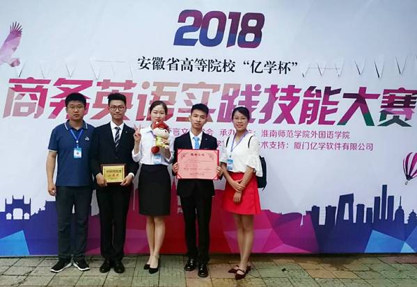 5月26至27日,第二届安徽省高等院校“亿学杯”商务英语实践大赛在淮南师范学院圆满落幕。经过各高校初赛选拔,共有来自安徽财经大学、安徽工业大学、安徽农业大学等18所院校代表队参加角逐。由我校外国语学院2015级英语专业学生周峰、耿梦、王翔组成的代表队荣获大赛二等奖、总分第三名的优异成绩。苏涛老师和黄邵娟老师获优秀指导教师奖。