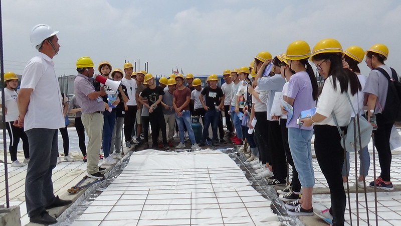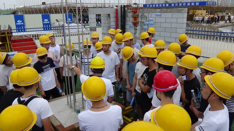 首先,建设办同志和施工总承包单位项目经理就国际工程师学院项目的总体建设概况、目前一期安全质量管理措施和工程进度等情况向学生们进行了详细介绍,并把事前准备好的实习材料分发给大家。随后,实习学生分成三个组,分别由建设办、项目经理、项目技术负责人和实习指导老师共同带队,进入一期一标段施工工地现场实习。三组施工现场带队人员,分别从三栋学生书院脚手架工程、模板工程及钢筋混凝土工程以及食堂与师生活动中心基础工程、地面防水工程的施工工艺、施工技术和施工管理方面对学生进行讲解。结合样板间、木工加工区及钢筋加工区,向学生们详细讲解每一道工序的具体做法与规范要求。针对学生提出的专业问题,带队人员耐心细致地进行解答,并对学生今后专业知识的学习进行指导。