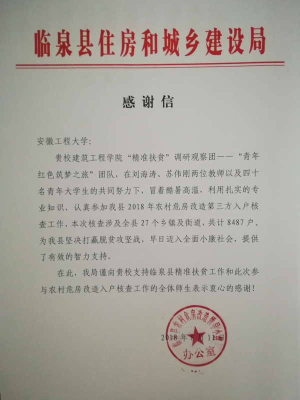 调研结束后,临泉县住建局专门向学校发了感谢信。局长陈继武、副局长王晓静代表住建局高度赞扬同学们不怕困苦、勇于实践的精神品质和令人佩服的专业素养,感谢学校带队老师不辞辛苦保障核查工作顺利完成,感谢学校团委和建筑工程学院指导师生参与助力临泉县脱贫攻坚工作。