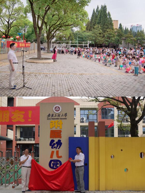 9月3日上午,安徽工程大学附属幼儿园举行了隆重而简朴的新园落成揭牌仪式暨开学典礼。落成的新园建筑面积达2200余平方米,共开设6个班级,可接纳180余名幼儿入学。校党委常委、副校长郭兴众,后勤集团总经理胡长新出席活动并为新园揭牌。