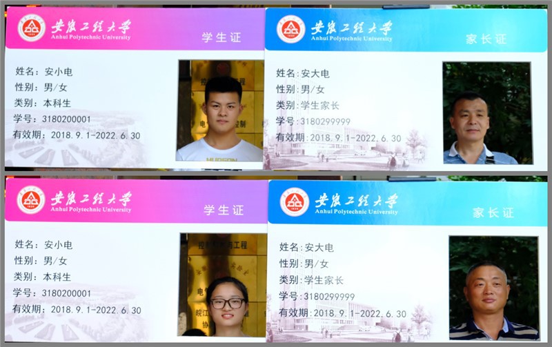 电气工程学院精心制作的学生证“安小电”和家长证“安大电”展板,供新生和家长们合影留念。让“安小电”们感受到自己已经正式成为了电气学院的一员,也让“安大电”们在电气学院留下了美好的回忆。与此同时,电气学院提供的多媒体家长休息室正播放着学校风景和学院风采视频。