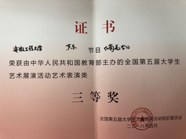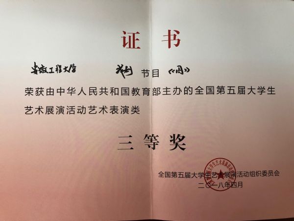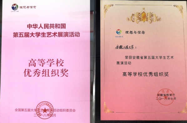 近日,全国第五届大学生艺术展演活动落下帷幕,我校选送的作品获得二等奖1项、三等奖2项,学校获“优秀组织奖”。此前,我校选送的作品参加安徽省第五届大学生艺术展演活动,获得一等奖7项、二等奖5项、三等奖8项,学校获“优秀组织奖”,22名指导教师被评为“优秀指导教师”。这是我校文化艺术活动获奖数量和级别历史性的突破。
