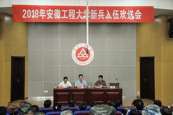 9月10日上午,学校在C座5楼报告厅隆重举行2018年新兵入伍欢送会。学校党委常委、副校长郭兴众,办公室、宣传部、教务处、研究生工作部、学生处(学工部)、财务处、保卫处(武装部)、后勤服务集团、团委等部门负责人,新兵所在学院党委副书记和辅导员,入伍新兵家长、退役复学老兵和在校生代表,共同欢送新兵光荣入伍。欢送会由校武装部部长陈其峰主持。