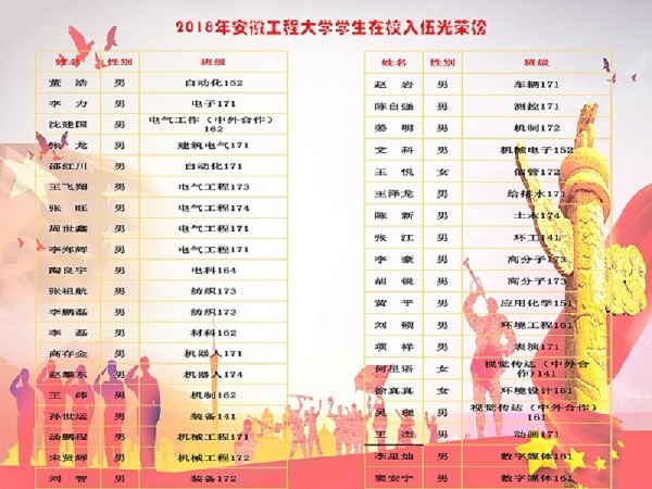 今年征兵工作开展以来,学校始终把大学生征兵工作作为一项严肃的政治任务来落实,深入宣传发动,经过报名、体检、政审、役前训练等环节,共有39名优秀青年在校入伍,其中3名女生。