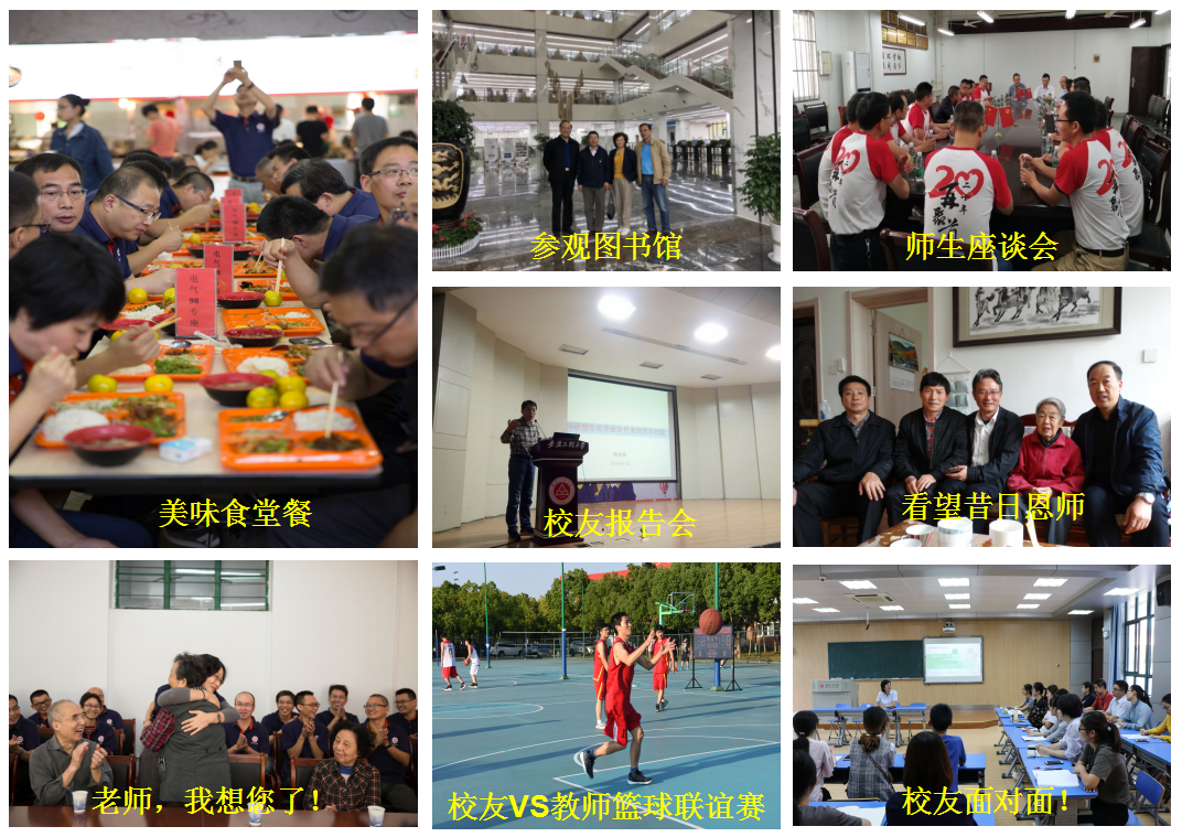 回到阔别已久的母校,穿梭在熟悉的教学楼、图书馆、学生宿舍、体育场,看到母校的发展和巨大变化,校友们感慨万千,纷纷为母校感到骄傲与自豪,也深深表达了对母校培育的感激之情。在返校活动中,校友们共同回忆了当年的求学轶事、成长经历,深切表达了对昔日老师和同窗好友的诚挚问候。各学院各班级积极开展了诸如师生座谈会、参观图书馆、校友报告会、看望昔日恩师、校友面对面、校友VS教师篮球联谊赛等形式多样、内容多彩的文体联谊活动及校友捐赠活动。校友会热烈欢迎并积极配合校友返校,为返校校友提供热情服务,同时精心制作了印有校园风景图和校友学籍照片的校友卡,方便校友们保存留念以及体验美味食堂餐。