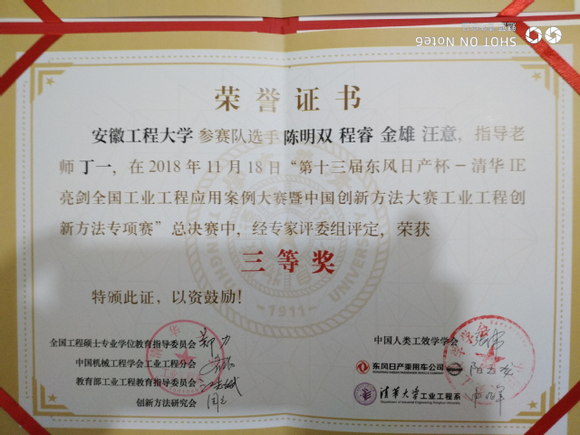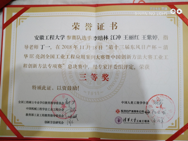 “清华 IE亮剑”全国工业工程应用案例大赛是目前国内工业工程领域影响力最大的比赛。十三年来,得到全国高校和企业的拥护和积极参与,为中国企业的管理水平提升和管理创新做出巨大贡献,因此也被中国科协、科技部正式认可为中国创新方法大赛的专项赛事。自2018年9月大赛开赛以来,在该院老师悉心指导下,参赛学生齐心协力、夜以继日,不断修改和完善各组的案例,展现了工业工程系学生“肯吃苦,能吃苦”的比赛精神。经过反复和细致的修改,我校工业工程系提交的三个案例最终在全国高校组的263个案例中脱颖而出,荣获全国三等奖。