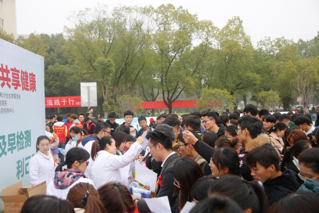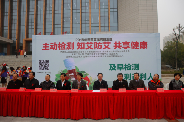 近日,由校医院主办、学生社团微尘社承办的2018年“世界艾滋病日”主题宣传活动在我校新图书馆广场举行。芜湖市爱卫会副主任张成胜,市海关党组书记、局长唐述林,市疾控中心主任程周祥、副主任杨康生,副校长郭兴众,学生处处长刘金斌,校团委副书记郭广春,芜湖日报、芜湖电视台、大江晚报等媒体记者出席本次活动。