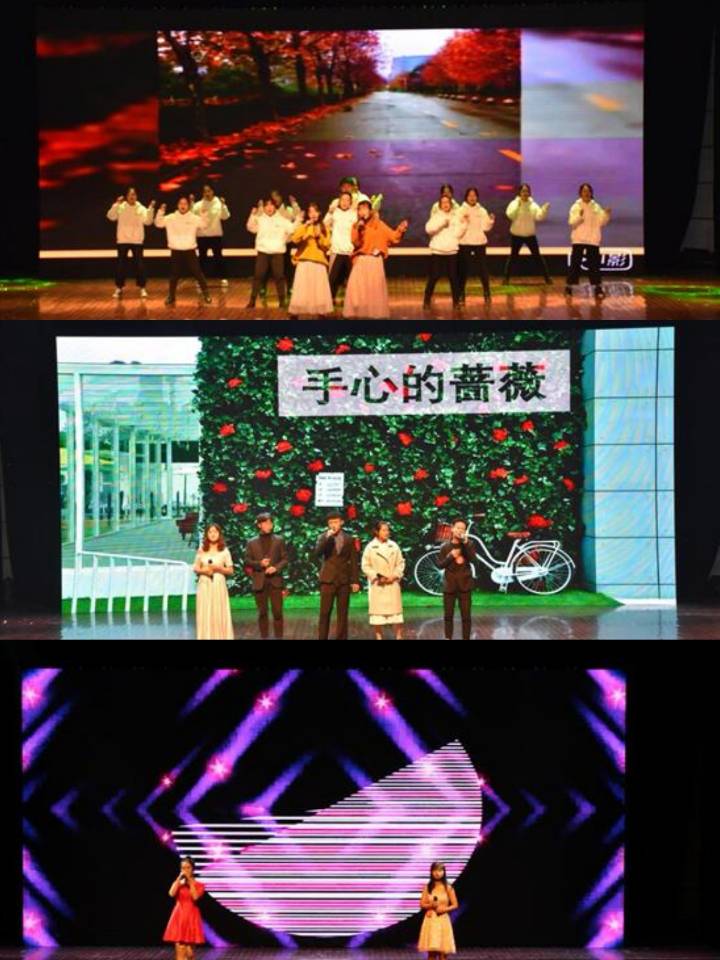 歌曲节目充满了温馨、励志的色彩。外国语学院的同学倾情演唱《没有什么不同》,鼓励大家积极乐观,奋力追逐梦想。表演唱《手心的蔷薇》、歌曲《我在人民广场吃炸鸡》由建工学院和爱乐社的选手奉上。他们用或温柔或燃情的音乐,表达出对纯真爱情的执着。
