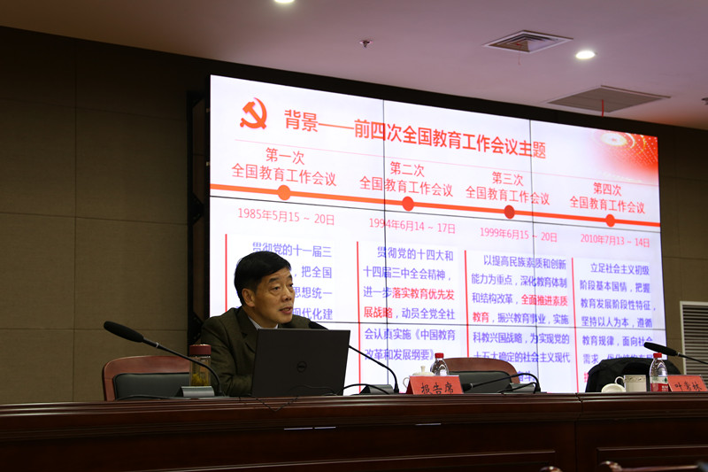 刘宁作了“学习贯彻全国教育大会精神 奋力开启地方特色高水平大学建设新征程”的专题辅导报告,他从充分认识全国教育大会的重大意义、深入学习领会习近平总书记重要讲话精神、奋力开启地方特色高水平大学建设新征程三个方面进行了阐述。他强调,建成国内知名、省内一流的地方特色高水平大学是全校师生的殷切期盼,更是全校师生的历史责任和使命担当;全校师生员工要以永不懈怠的精神状态和一往无前的奋斗姿态,把学习贯彻全国教育大会精神与学习贯彻学校第二次党代会精神紧密结合,抓好传达学习,抓好工作落实,抓好氛围营造,写好贯彻落实全国教育大会精神、加快地方特色高水平大学建设的“奋进之笔”。
