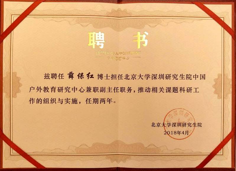 随后,丁嘉辉向薛保红老师颁发了聘任证书,正式聘任其担任北京大学深圳研究生院中国户外教育研究中心兼职副主任,负责开展校际户外教育科研合作工作。会议还安排了我校张雅如同学的实习岗位和实习任务。与会人员考察了北京大学深圳研究生院户外教育研究基地和汇丰商学院。