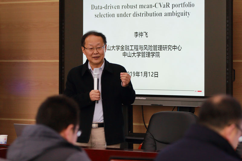 李仲飞在题为《Data-driven robust mean-CVaR portfolio selection under distribution ambiguity》 的学术报告中介绍了分布模糊下数据驱动的稳健均值CVAR投资组合选择的问题,他先对现有的投资组合选择模型进行了介绍。随后,提出这些理论模型存在的共同缺陷:隐含假定信息是完全的,例如分布是已知的,这与现实不符。最后,详细介绍了自己研究的CVAR投资组合选择的问题。