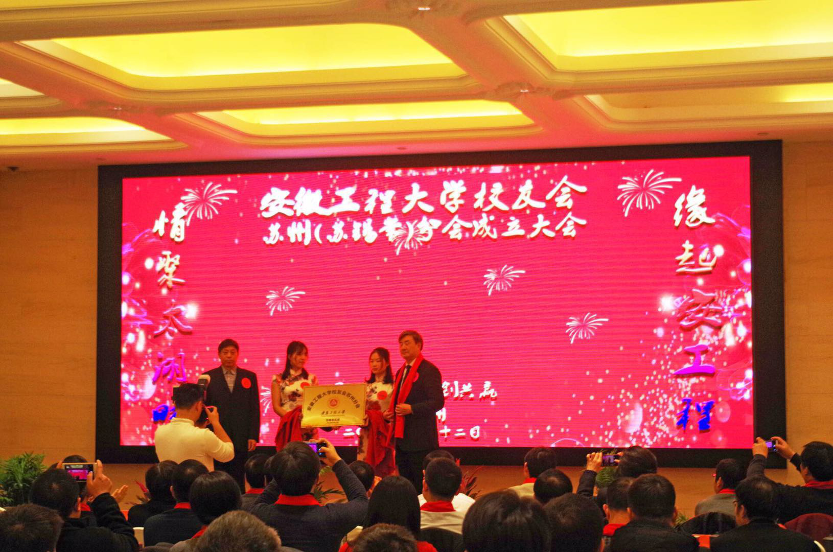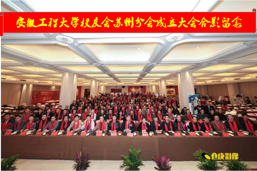 2019年伊始,安徽工程大学校友会再喜添一员。1月12日,校友会苏州分会成立大会在素有东方水城美誉的苏州隆重召开。校党委副书记、副校长王绍武,校党委副书记、校友会会长苏国红,发展规划处处长、校友会副会长兼秘书长曹安照,办公室主任、校友会副会长王弘,工会主席、校友会副会长王河及各学院分会负责人与苏锡常及周边地区200余名校友代表欢聚一堂,共同庆祝分会成立。大会由苏州分会筹备组成员、电子95级校友张雪峰主持。
