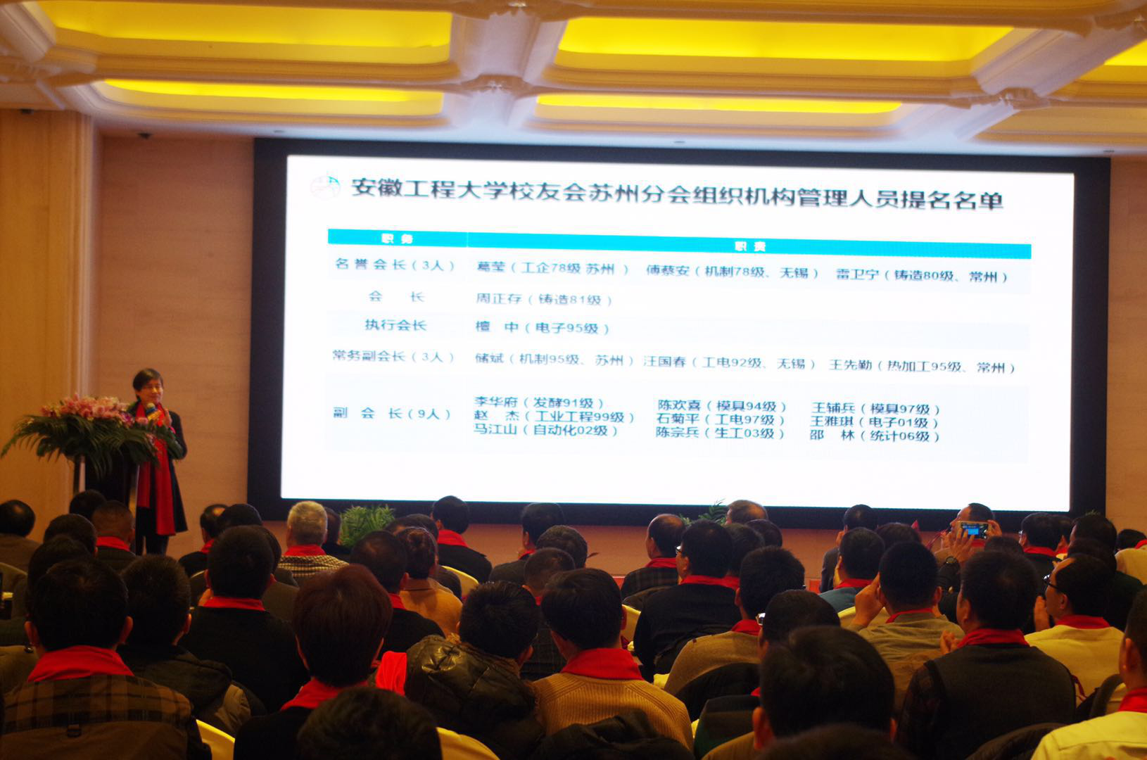 苏国红宣读《关于同意召开安徽工程大学校友会苏州分会成立大会及机构主要负责人建议名单的决定》。