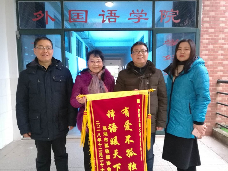 日前,芜湖市孤独症协会会长许晓鸣一行来到我校外国语学院,向学院赠送了“有爱不孤独、译语暖天下”的锦旗,感谢外国语学院徐鹏老师为孤独症协会手工制品“汇爱星”商标提供了英语翻译服务。学院党委书记魏长顺与副院长黄焰结代表学院接受了赠旗。