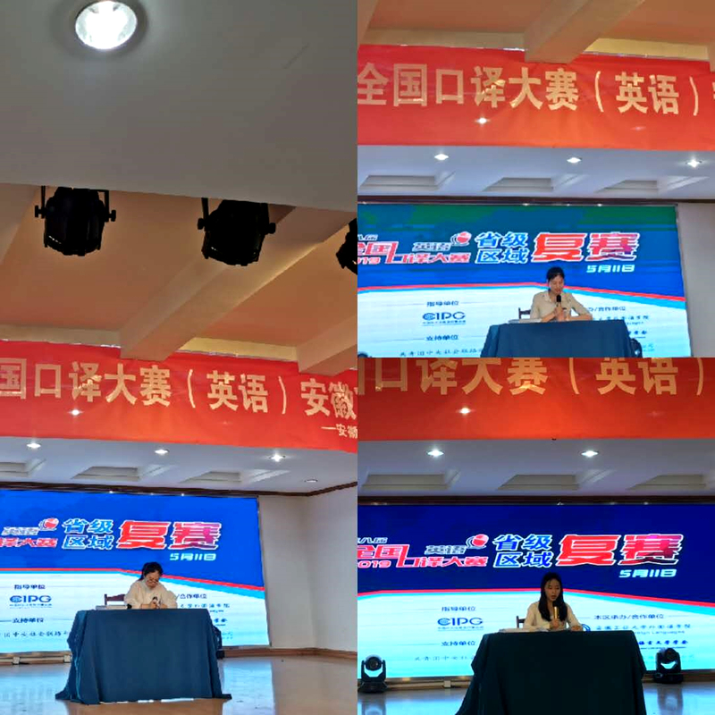 安徽赛区复赛分初赛和决赛两个环节。上午的初赛(英译汉)中,来自全省各高校的百名选手在三个分赛场同时竞技,经过紧张激烈的初赛,评委团从信息传达、技巧运用、职业素养等方面考察参赛选手的综合水平,在110名选手中遴选出36名晋级下午的决赛(汉译英)。大赛要求选手在2分钟之内针对赛场播放的音频进行现场传译,内容涉及墨西哥文化、虫洞等话题,对选手提出了极高的要求,不仅是英语应用能力和知识储备的考验,也是口译技巧和应变能力的挑战。汪珊、任婧婧、徐彤、周峰4位同学面对来自众多院校的选手,沉着冷静,展现出良好的现场应变能力和竞技状态,凭借扎实的语言能力、流畅的口译表达和良好的心理素质取得优异的成绩。