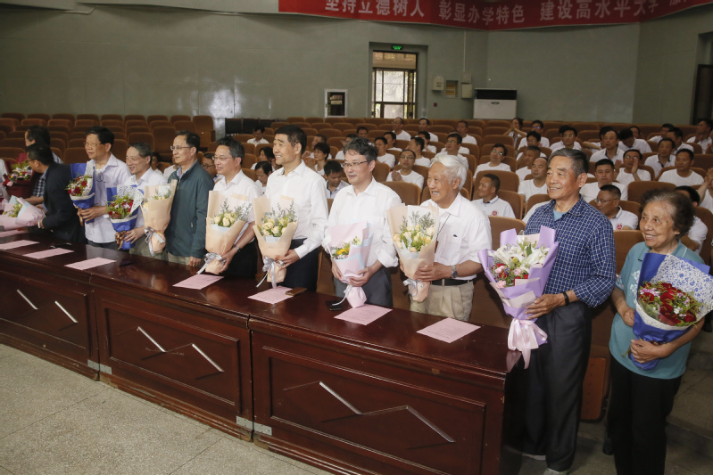 一曲《老师好》深情地唱出了校友们对昔日老师的感恩之情,现场的老教师们见到当年的学生功成名就、结伴归来更是难掩激动之情。机械学院蒋中明老师、电气学院金衍庆老师代表老教师发言,孙从远老师代表老教师亲自书写了一副字画送给返校的85级校友们。 校友们也向老师们送上鲜花,以花的芬芳向老师致敬,会场画面温馨无比。