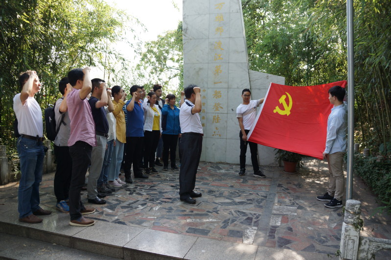 在讲解员的带领下,大家来到“渡江战役第一船登陆点”纪念碑前,举行庄严的重温入党誓词活动,党员们在纪念碑前,面对党旗,举起右手,庄严宣誓。铮铮誓言激励大家要时刻不忘初心,牢记使命,工作中要坚持社会主义办学方向,落实立德树人根本任务。