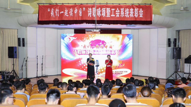 (本网讯)5月22日,我校“我们一起读中国”庆祝新中国成立70周年诗歌咏颂暨工会系统表彰会在学术报告厅举行。校党委书记刘宁,校党委副书记苏国红,校党委常委、纪委书记王红月出席,组织部、宣传部、人事处、工会、团委部门负责人,校工会专兼职干部,受表彰的个人和集体代表,师生代表共300余人参加大会。