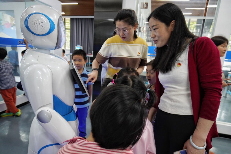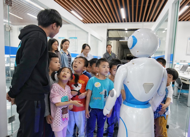 见到机器人在工作人员的操作下千姿百态,小朋友们目不转睛,大开眼界。