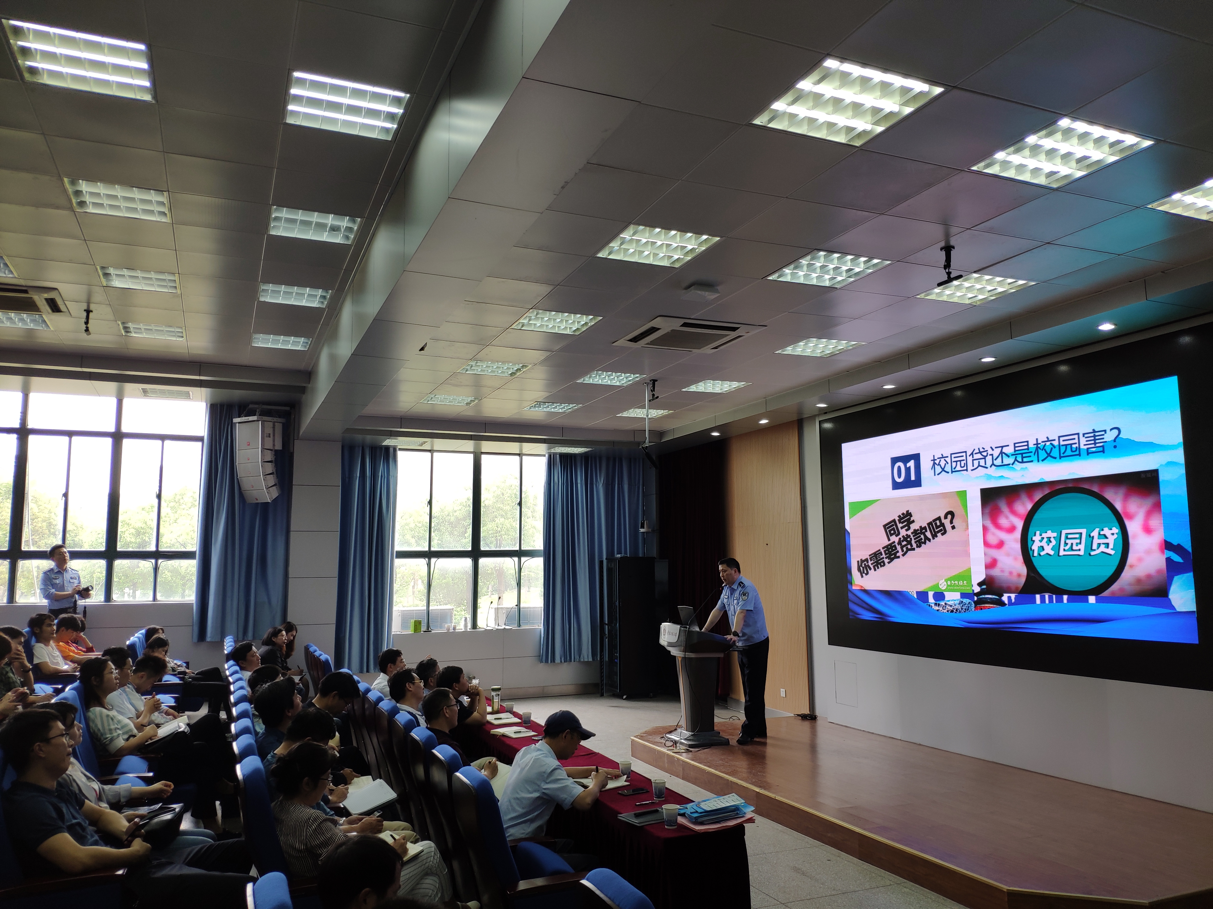 尹兵通过发生在校园里的真实案例讲述大学生应当如何应对校园贷、网络诈骗、网络谣言、传销和邪教组织、出行安全和心理健康障碍等六个方面问题。他指出,近年来,“非法校园贷”等网络陷阱在校内扩散与蔓延,严重影响了学生的身心健康和人身安全,大学生应重视个人信用的责任和担当,讲究理性消费;通过了解常见的六种网络诈骗主要形式,学会用正确的方式要武装好自己的内心,警惕自己的欲望,坚守诚信的底线;网络不是法外之地,每个人都要对自己的言论负责,必须遵守网络相关法律法规,文明互动、理性表达,做文明的网络使用者;对于各类非法组织要时刻保持警惕性,凡事多问几个为什么,防止上当受骗或做与法律相悖之事,在接触中相关信息后应主动报告学校保卫部门或公安机关,不断加强学习,树立正确的三观,提高辨别是非的能力;在生活中应牢固树立“危险就在身边”的防范理念,在追求成为社会人的新鲜与刺激中,时时刻刻把“安全”两字摆在心中;学习和生活期间要学会保持情绪稳定和心态平衡,要懂得正确认识自己,保持自信,勇于接受别人,敢于交往,学会发泄情绪,找到自己兴趣,在遇到心理障碍时寻求专业心理咨询。