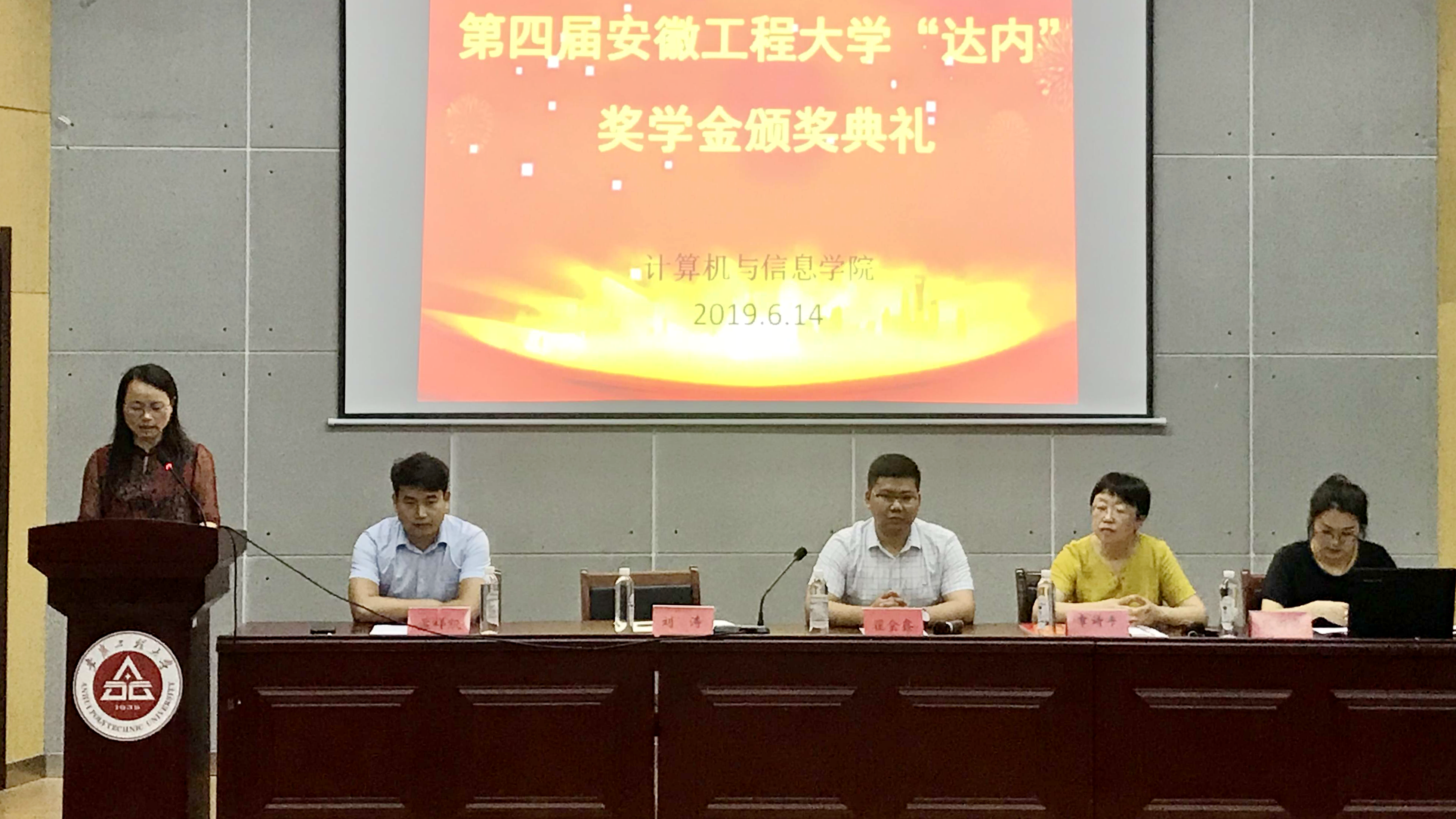 本网讯 6月14日下午,第四届安徽工程大学“达内”奖学金颁奖典礼在C座5楼报告厅举行。参加典礼的有达内集团安徽基地院校合作总监翟金鑫、达内集团安徽省基地院校区域经理孟祥凯、计算机与信息学院负责人以及获奖学生。