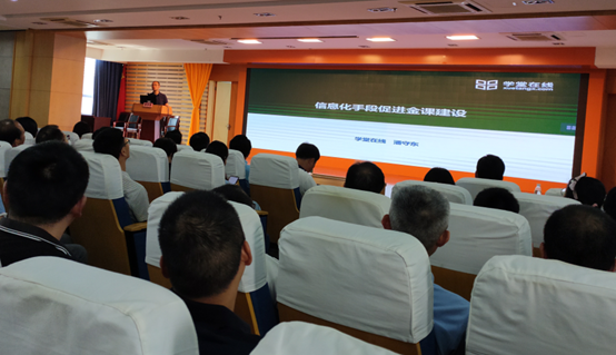 会上,清华大学学堂在线副总裁潘守东采取“雨课堂”授课模式介绍了信息化和教育深度融合“金课”的几种常见模式,阐述了要合理运用现代信息技术手段,开辟“智能教育”新途径的教学理念。随后教育部全国高校网络培训中心特聘教授,贵州理工学院陈燕秀以“充满生机的混合式教学之路”为题与老师们分享建设“金课”的经验,陈燕秀以自己的实际教学课程《电路原理》为例,分享了使用 “雨课堂”进行教学改革后课前、课中、课后每一个环节的变化,并展示自己的翻转课堂,给予学生主动参与的学习体验,老师由传统的教学权威变为学习的促进者。最后清华大学“雨课堂”高级培训师刘鹏详细讲解了“雨课堂”从下载、安装到移动端、电脑端的操作使用步骤,带领与会老师体验课程融入信息化教学工具后的变化。