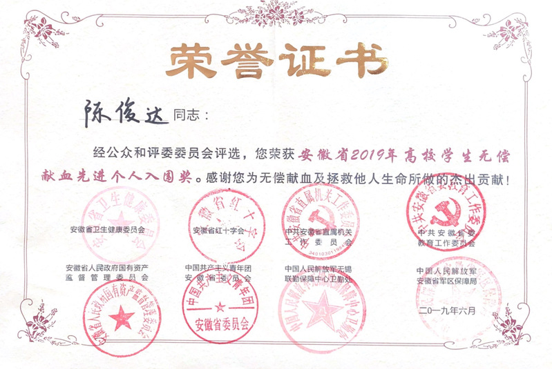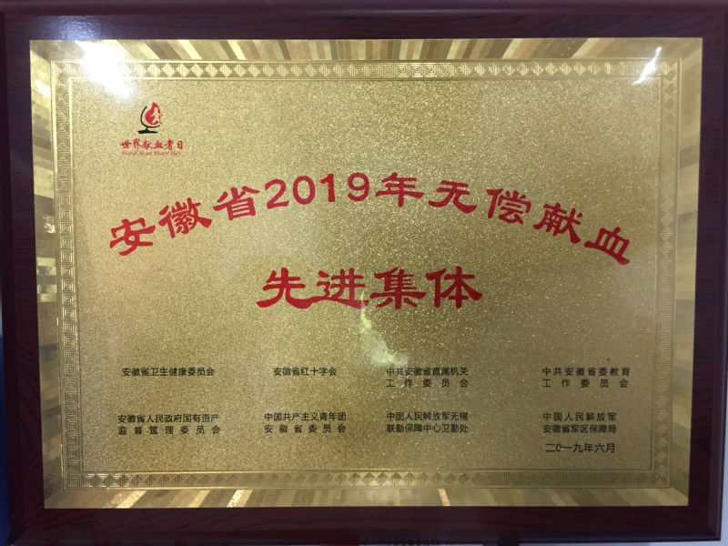 本网讯 近日,在2019年安徽省暨合肥市“世界献血者日”表彰大会上,我校荣获安徽省2019年无偿献血先进集体,建筑工程学院土木2015级本科生陈俊达入围安徽省2019年高校学生无偿献血先进个人称号。