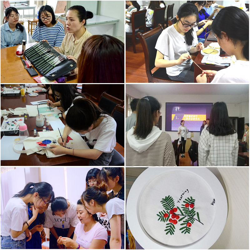 此次锦绣纺服公益计划,同学们对传统刺绣艺术的热情最为热烈,学院增设了两个刺绣班,还为刺绣班的每位同学都配备绣棚、绣线等基本工具。6月1日开始,每到周六,在D座214,都会看到党员教师邬红芳带领同学们沉浸在刺绣美学中的身影。邬老师亲切优雅的给同学们讲诉了刺绣的起源、刺绣所包涵的意义、刺绣在历史上的发展以及国内外刺绣的不同之处。随后邬老师又为同学们亲身示范了刺绣的十余种基础针法,并针对每个学员的情况,进行手把手教学。最终,同学们在自己的努力和老师的耐心帮助下完成了人生中的第一件绣品,也度过了充实有意义的周末时光。
