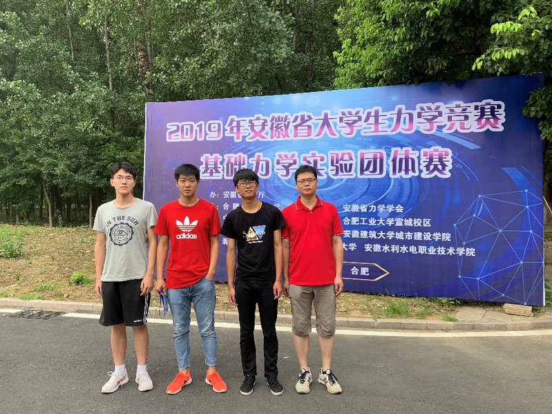 本网讯 7月16日,2019年安徽省大学生力学竞赛基础力学实验团体赛在合肥工业大学翡翠湖校区举行,共有10所院校组建的10个团队参赛。成绩当日揭晓,我校参赛团队位列第四,荣获团体二等奖;廖斌老师荣获优秀指导教师奖。