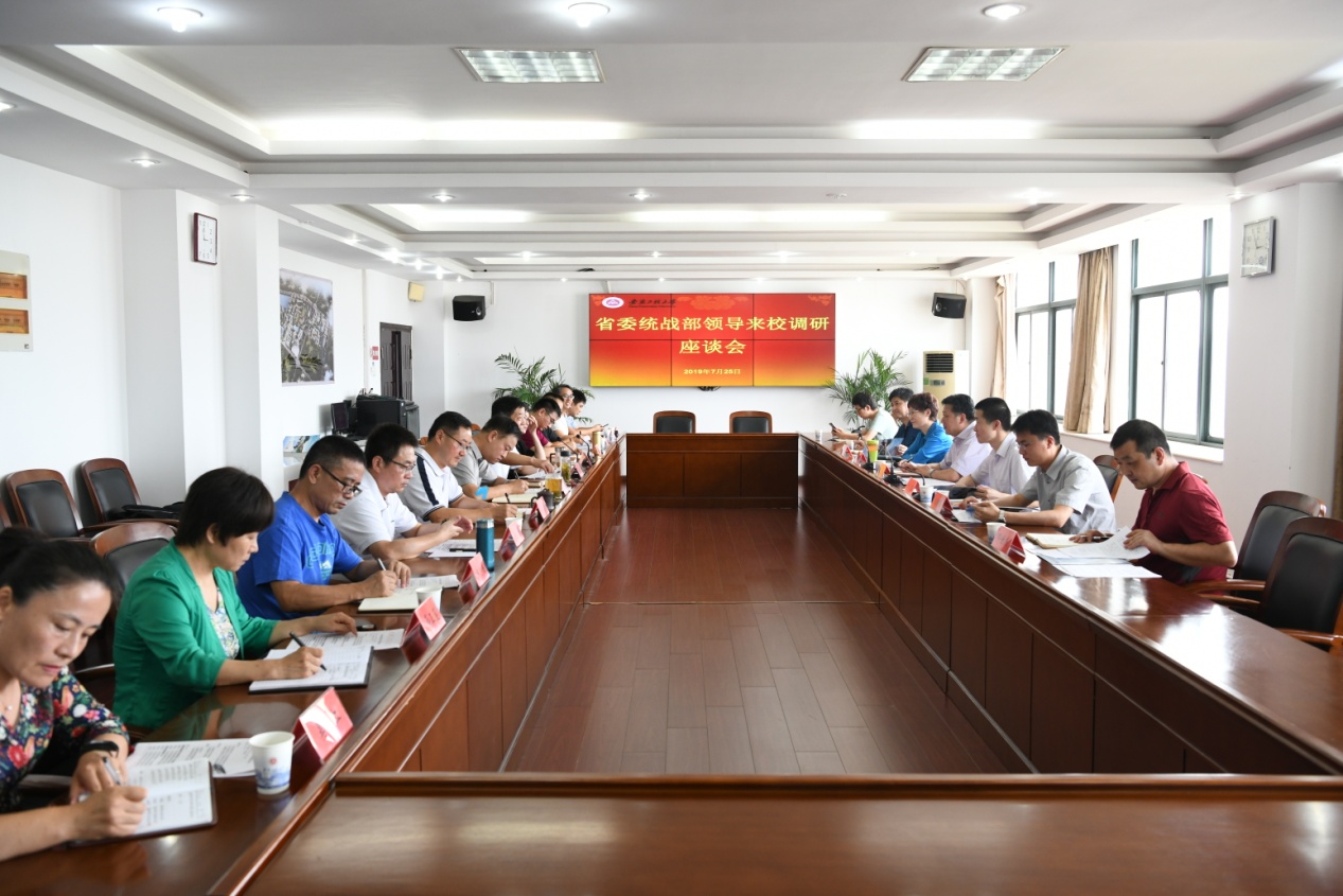本网讯 7月25日,省委统战部常务副部长陈昌虎、民主党派工作处副处长郑向春等,在芜湖市委统战部常务副部长褚云凤等陪同下来我校调研,深入了解民主党派代表人士队伍建设的基本情况和主要经验做法、存在的主要问题、对策建议等。校党委书记刘宁,党委副书记苏国红,党委组织部、党委宣传部(统战部)负责人,省政协委员、省知联会副会长、学校副校长叶常林,学校民革、民盟、民建、民进、致公、九三等党派基层组织负责人出席会议,会议由刘宁主持。