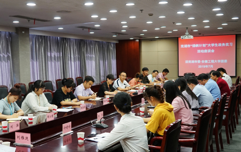 7月30日上午,校党委副书记苏国红带队前往芜湖市政务中心看望慰问参加2019年芜湖市“扬帆计划”政务实习的大学生代表,与团芜湖市委、政务实习单位代表以及学生代表进行座谈,并指导校团委与团芜湖市委签署校地共青团工作战略合作框架协议。