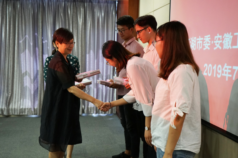 苏国红听取了团芜湖市委关于2019年芜湖市“扬帆计划”大学生政务实习活动开展情况的介绍。我校参加本次政务实习的9名大学生代表先后分享实习以来的体会与感悟,芜湖市政法委、芜湖市投资促进中心等政务实习单位代表作交流发言。团芜湖市委以及政务实习单位给予我校大学生高度评价,认为我校大学生综合素质高、学习能力强,彰显了良好的精神风貌与青年大学生的风采。苏国红向参加政务实习的大学生赠送了《习近平讲故事》《中国哲学简史》两本书籍。
