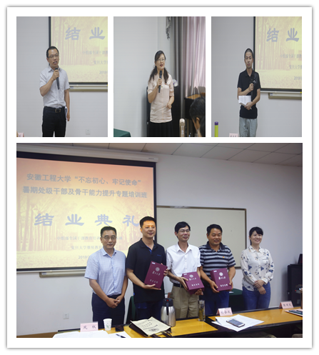 结业典礼上,学员代表校团委副书记蔡金平、人文学院党委副书记金艾裙、管理学院教授桂云苗分别代表部门、学院干部和业务骨干作了交流发言。郑健在总结培训班各项工作的基础上,希望各位学员一定要坚定信念、做靠得住的人,积极进取、做踏实干事的人,勇于创新、做有担当的人,以更加饱满的工作热情和扎实的工作作风,为部门、学院和学校发展作出自己更新更大的贡献,在学校即将开展的“不忘初心、牢记使命”主题教育中展现担当作为的良好形象。