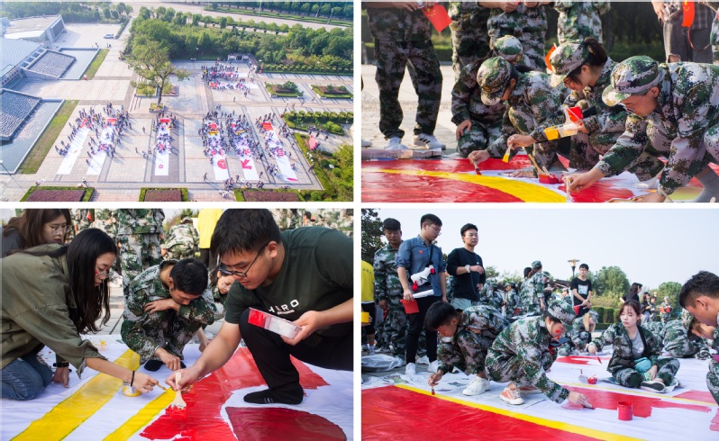 上午8时许,参加特别主题团日的600余名师生齐聚烈士陵园广场,以校级学生组织为单位,分为8个小组,在“L”型分散平铺在地上的300平方画布上,用手中的画笔,一步步的描绘心中的图案,“华表、彩带、和平鸽”“国旗、团旗、天安门”逐步成型。庄严肃穆的烈士陵园广场充满着青春气息。最后,根据单体画布的要素,8块分图实现了完美拼接,构成了一幅庆祝中华人民共和国成立70周年的“巨画”。全体师生环绕“巨画”挥舞着手中的国旗,齐声呐喊“我与祖国共奋进,青春共筑中国梦”。