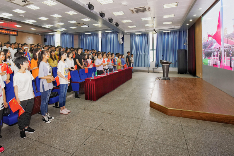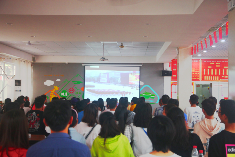 2019年10月1日上午,庆祝中华人民共和国成立70周年大会、阅兵式、群众游行在北京天安门广场隆重举行。中共中央总书记、国家主席、中央军委主席习近平出席大会并发表重要讲话。广大师生通过电视、广播、网络等方式集中收听收看直播盛况。