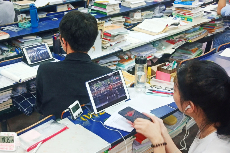 全校共有30多个会场同步收看了庆祝中华人民共和国成立70周年大会、阅兵式和群众游行实况。此外,学校广大师生员工还通过电视、网络直播、移动终端、广播等多种方式在办公室、图书馆、食堂、家中以及旅途中收听收看大会盛况。