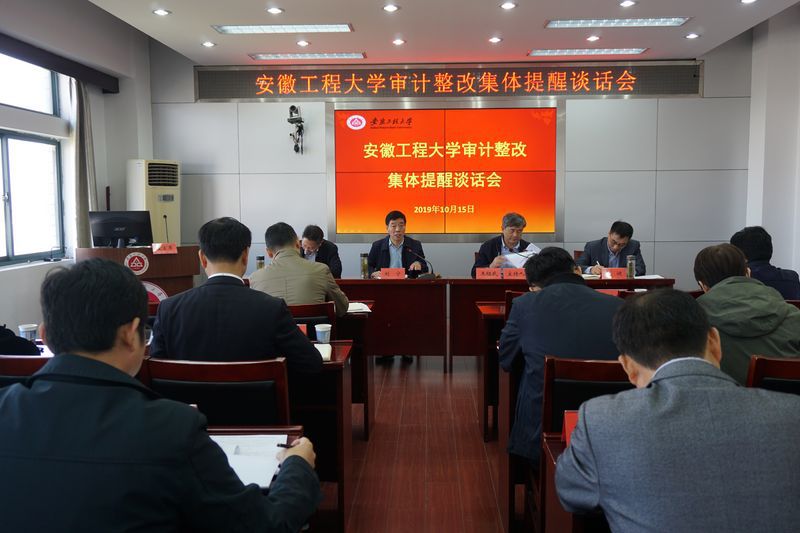 本网讯 为扎实推进“不忘初心、牢记使命”主题教育,把检视问题、落实整改做实做细,进一步推深做实审计整改工作,10月15日上午,学校在行政楼1121会议室召开审计整改集体提醒谈话会。校党委书记刘宁出席会议并讲话,校党委副书记、校长王绍武主持会议。校党委常委、副校长郭兴众,郑健,纪委办公室、审计处主要负责同志参加会议。