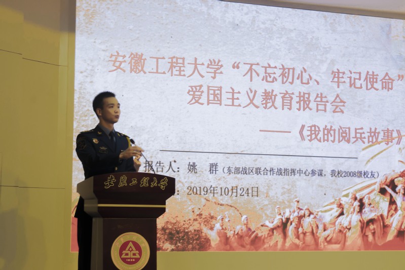 为进一步深化“不忘初心、牢记使命”主题教育,扎实开展爱国主义教育、先进典型教育,10月24日,东部战区联合作战指挥中心参谋、管理学院2008级物流管理专业校友姚群应邀来校作《我的阅兵故事》主题报告。各学院学生党员代表、部分发展对象、入党积极分子代表共 300余人参加了报告会。报告会由校党委副书记苏国红主持。