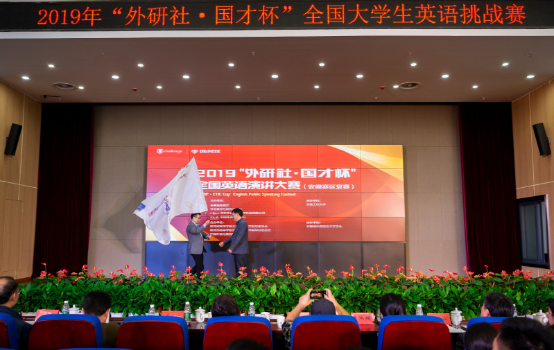 闭幕式上,安徽大学教授詹全旺对大赛进行了点评。他认为此次赛事参赛院校众多、赛题广泛、赛事水平高,充分证明了近几年来安徽英语教育界做出的巨大努力。外语教学与研究出版社高等教育营销中心袁硕为本次大赛承办单位安徽工程大学颁发优秀组织奖,黄焰结上台领奖并发表获奖感言。他对参赛选手、指导老师、评委专家、志愿者和主办方等表示感谢,指出大赛为安徽省高校的外语人提供了互相学习与交流的平台,将大力推动我省外语教学事业的发展。闭幕式上还进行了下届赛事的交旗仪式,宿州学院外国语学院院长李加强接过赛旗并诚邀大家2020年相约宿州,共同书写外语教学事业新篇章。