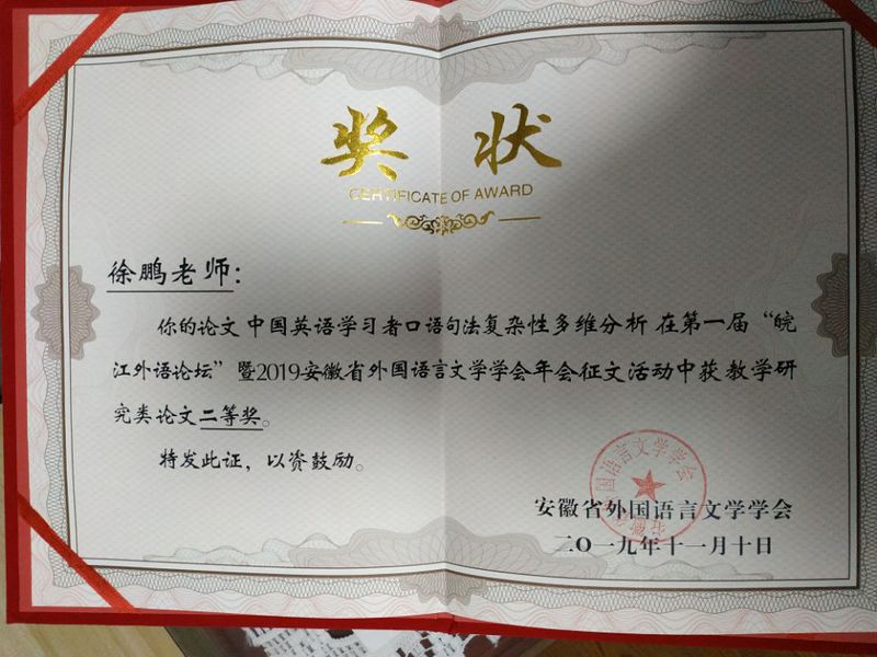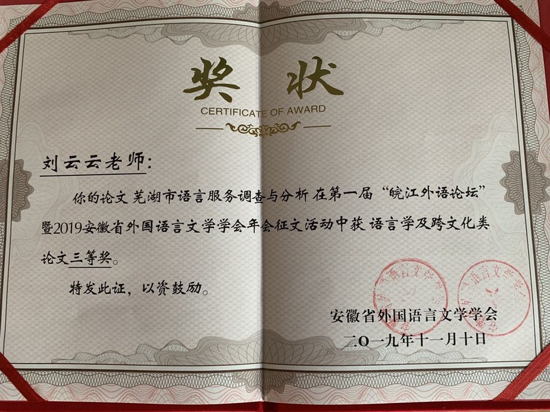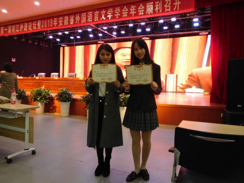 此外,外国语学院徐鹏和刘云云两位老师也在2019年安徽省外国语言文学学会年会征文活动中表现不俗,分别荣获教学类论文二等奖和语言学及跨文化类三等奖,并受邀参加了颁奖典礼。