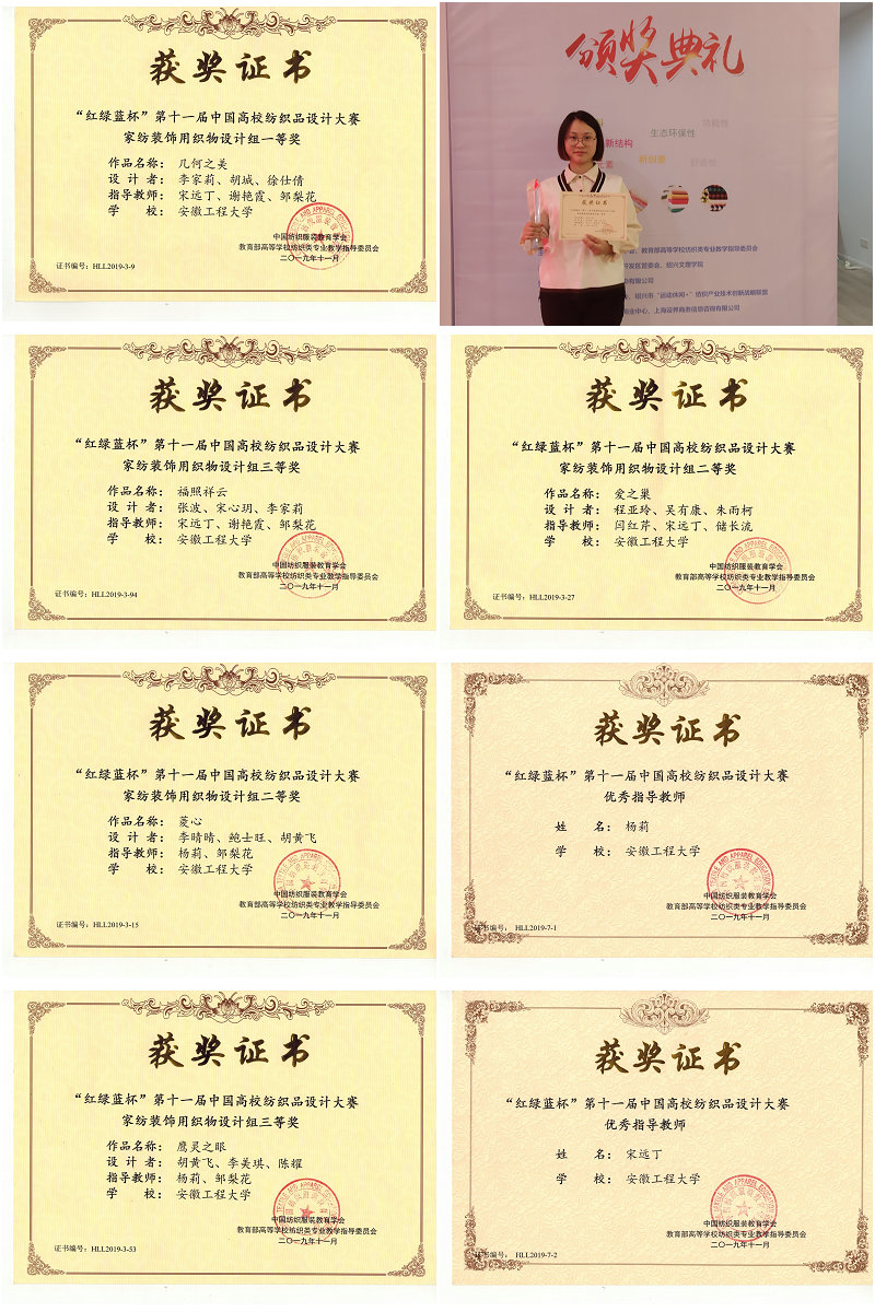 “红绿蓝杯”第十一届中国高校纺织品设计大赛由中国纺织工业联合会指导,教育部高等学校纺织类专业教学指导委员会主办。中国工程院院士蒋士成、中国纺织服装教育学会会长倪阳生以及多位同行专家、高校领导和来自全国的获奖师生代表出席大会颁奖典礼。此次大赛共收到了国内47所院校的1919件参赛作品,2016级纺织工程专业李家莉、胡城、徐仕倩同学合作的《几何之美》脱颖而出,获得家纺装饰用织物设计组一等奖,另有4件作品分获大赛二等奖和三等奖,宋远丁、杨莉老师获得优秀指导教师奖。