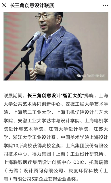本网讯 11月26日至28日首届长三角创意设计联展在上海智慧湾科创园举办,我校喜获高校展区金奖。艺术学院党委书记黄凯、院长陆峰围绕设计教育、产业与城市创新、长三角设计驱动产业论坛、长三角设计教育发展论坛等配套主题活动中进行了主旨演讲和专家访谈。