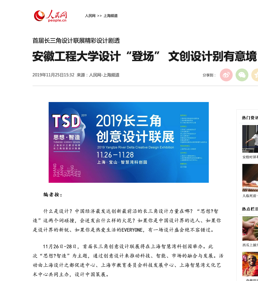 艺术学院设计艺术研究中心于7月11日开始筹备本次联展工作,经过4个月的精心准备,选送了产品设计、工业设计、视觉传达设计、动画设计等专业28件作品参展(通过2个展区展示,是安徽高校最大的展区)。展示成果被人民网、东方网、设计中国等国内知名媒体报道,极大的提升了我校在长三角的知名度,对我校起到了很好的宣传作用。