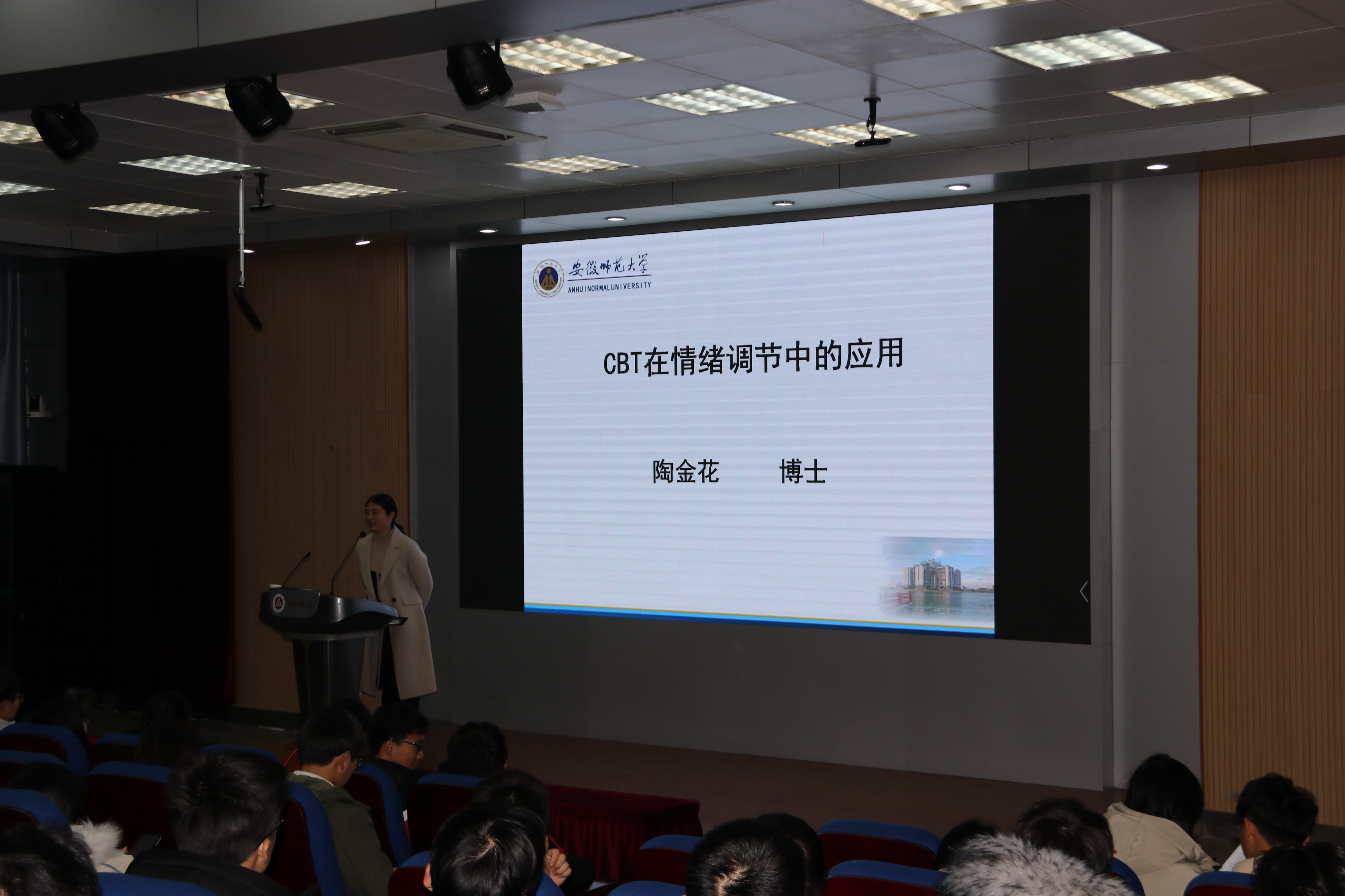 本网讯 为进一步在大学生中普及心理健康知识,提高心理维护技能,按照校2019年“12•5”心理健康活动节工作安排,学生处心理健康教育与咨询中心在5教117室举办主题为“CBT(认知行为疗法)在情绪管理中的应用”心理健康知识讲座,各学院心理部、班级心理委员、寝室长代表共200余人聆听了讲座,安徽师范大学心理学系博士、硕士生导师陶金花应邀主讲。