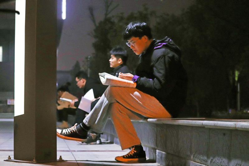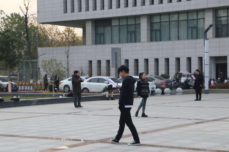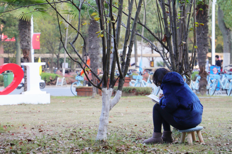 或坐或立或漫步,或读或背或提问,几人伴夕阳,努力为圆梦。