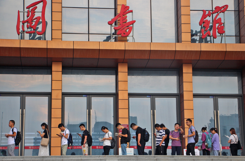 在图书馆开门前,长长的队列早已等候多时,每个人都有序地为自己的梦想排队等待。