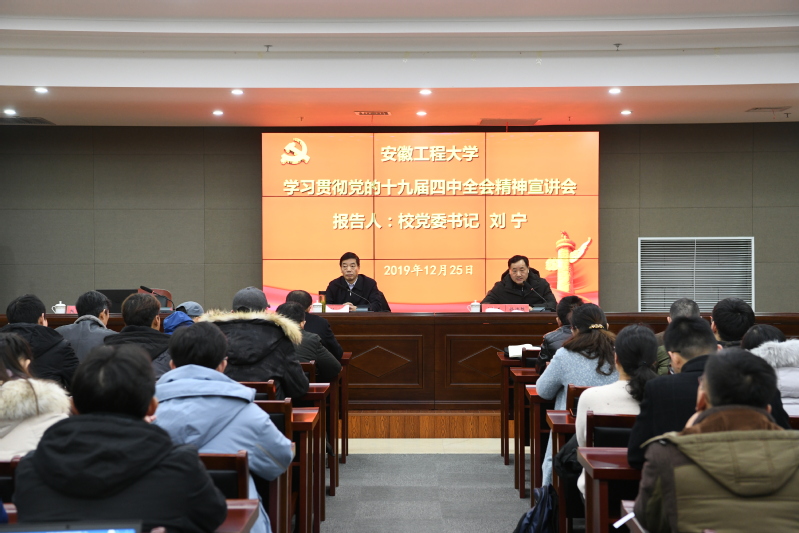 本网讯 12月25日,校党委书记刘宁作题为《学习贯彻党的十九届四中全会精神 推进学校治理体系和治理能力现代化》专题报告,宣讲党的十九届四中全会精神。各学院党委副书记、团委书记、组织员,各学院党支部书记代表、学生党员代表,宣传部、组织部科级以上干部参加。会议由校党委常委、宣传部部长孙浩然主持。